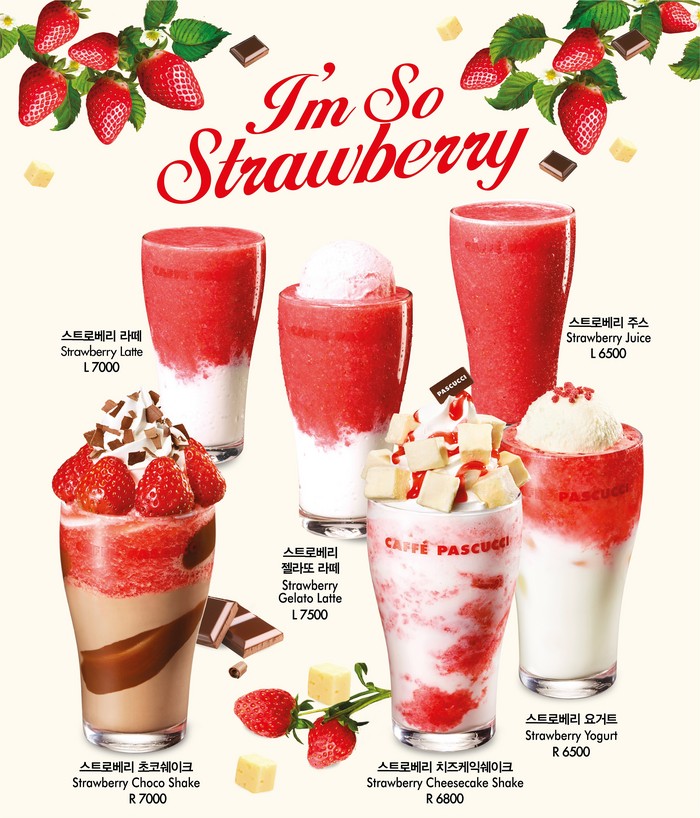 파스쿠찌의 딸기 음료 6종은 ▲스트로베리 치즈케익쉐이크 ▲스트로베리 초코쉐이크 ▲스트로베리 요거트 ▲스트로베리 젤라또 라떼 ▲스트로베리 라떼 ▲스트로베리 주스 등으로, 통째로 갈아 넣은 생 딸기와 다양한 토핑으로 화려한 색감과 다채로운 식감이 특징이다.