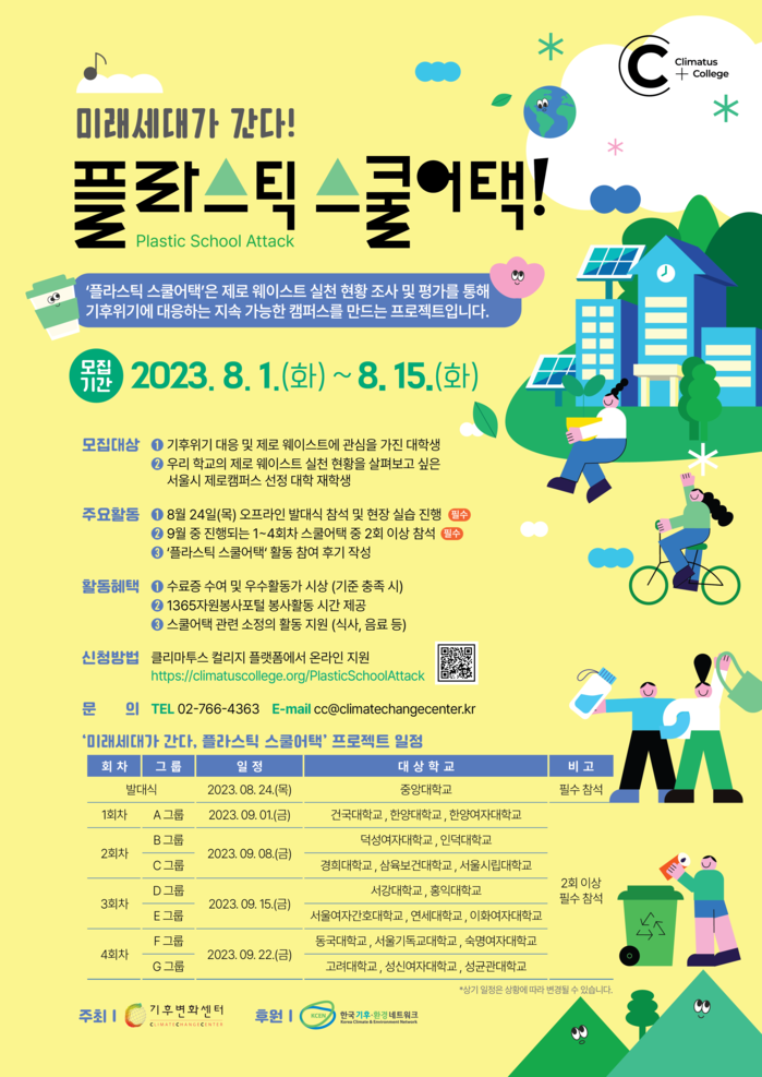 주최측은 "잘 지켜지고 있는지, 더 필요한 것은 없는지", 제로캠퍼스 도달까지 어떤 과제들이 남았는지 여러 궁금증이 꼬리를 이어지고 있다. 이러한 궁금증 해결을 위해! 클리마투스 컬리지에서 '플라스틱 스쿨어택'을 진행하게 됐다고 설명했다.