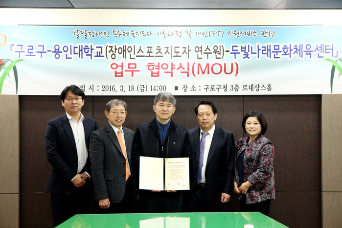구로구와 두빛나래문화체육센터는 효과적인 개인별 맞춤 체육지도를 통해 발달장애인의 사회적응능력과 건강을 증진시키기 위해 용인대학교와 업무협약을 맺었다.