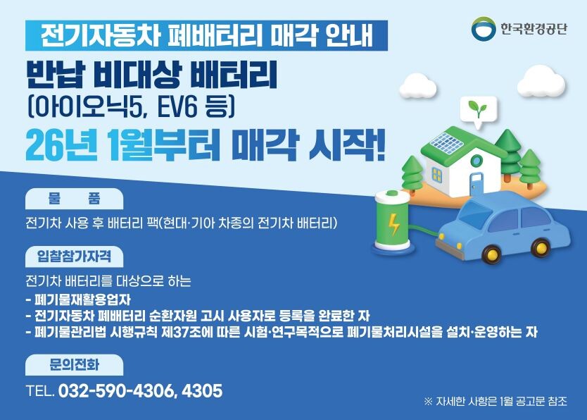 K-eco 한국환경공단(이사장 임상준)은 16일부터 전기차 사용 후 배터리 유통지원 시범사업의 일환으로, 국가 반납 의무가 없는 전기차 사용 후 배터리 민간 공급을 본격적으로 시작한다고 밝혔다. 대상 차종은 아이오닉5, EV6 등 현대·기아 차종의 전기차 배터리다.
