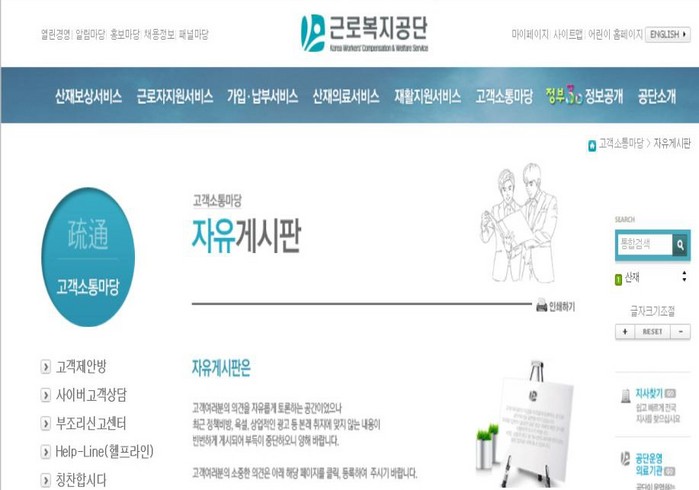 | ▲근로복지공단은 최근 자신들이 운영하는 고객소통마당 자유게시판을 폐쇄조치했다. 이유인즉 최근 정책비방, 욕설, 상업적인 광고 등 본래 취지에 맞지 않는 내용들이 빈번하게 올라와 부득이 중단한다고 밝혔다. 이에 대해 반올림측은 국내 산재로 고통받은 근로자만 매년 수천여명이 달한다. 이들의 법적 보호장치의 마지막 수단인 근로복지공단인데 이들이 이런 핑계로 고의적으로 폐쇄하는 것으로 보인다고 말했다. 공단은 사실상 대기업의 편이지 근로자의 동지가 아니다고 잘라말했다. © 환경데일리 |