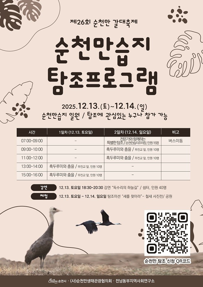 순천만의 생태적 가치가 높아 전 세계 흑두루미의 절반가량이 날아드는 월동지다. 올해에도 역대 가장 많은 8000마리 이상이 찾아온다.