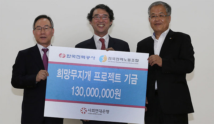 [환경데일리 온라인팀] 한국전력공사(사장 조환익)가 지난 2015년 4월 30일(목) 전력노조 및 사회연대은행과 함께 저소득 취약계층 자립 및 지역경제 활성화를 위한 '희망무지개프로젝트' 기금 전달식을 가졌다.