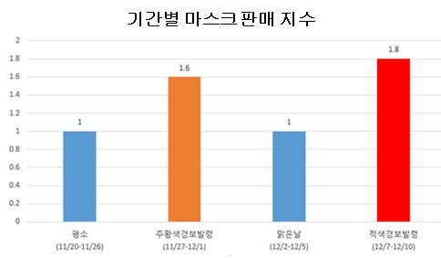 12월 9일 마스크 판매량은 전체 판매량의 9.3배로, 주황색 경보발령기간의 판매량의 3배에 달성하면서 마스크는 외출 시 필수품으로 꼽혔다. 미세먼지를 차단해주는 마스크의 경우 소비자들 역시 미세먼지의 공포가 커질수록 마스크의 수요는 급증하고 있으며, 이러한 소비자들의 불안 심리는 마스크 매출 추이로 고스란히 드러나고 있다.