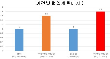 알리건강(阿里健康)보고서에 따르면, 지난 적색경보 기간 동안 타오바오 마스크, 혈압측정기제품 판매량이 수직선으로 급증하면서 12월 12일 하루 엄청난 판매량을 달성했다고 전했다. 11월 27일~12월 1일 주황색 경보발령 기간 동안 마스크 판매량은 평소에 비해 확연한 차이를 보이고 있으며 적색경보 발령이 내렸던 12월 7~10일 최고치 달성했다.