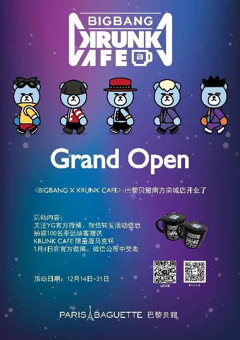 파리바게뜨 상하이 남방상청점은 기존 점포를 새롭게 단장해 문을 열며, 아이돌그룹 빅뱅 멤버들의 모습을 YG의 캐릭터 상품인 크렁크로 형상화한 빅뱅 크렁크(BIGBANG X KRUNK)로 2층 카페공간을 꾸몄다.