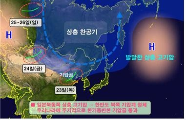 26일(일)까지 일본 북동쪽 부근에 발달한 상층 고기압(약 5km 상공)이 정체하면서 우리나라 부근으로 한기를 동반한 기압골이 자주 통과함에 따라 잦은 날씨변화가 예상된다.