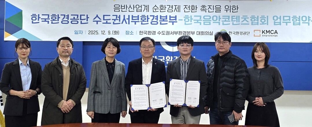 K-eco 한국환경공단 수도권서부환경본부(본부장 윤완우)는 9일 한국음악콘텐츠협회(이사장 최광호)와 '음반산업계 순환경제 전환 촉진 위한 업무협약'을 맺었다.