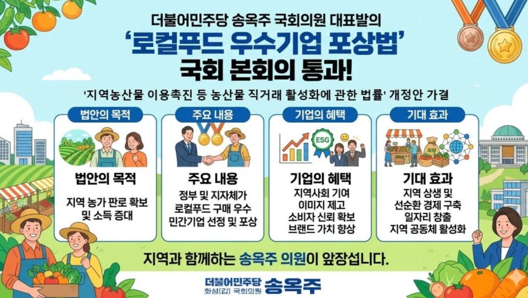 국회농해수위 소속 송옥주 의원(더불어민주당, 경기 화성시갑)이 대표발의한 '로컬푸드 우수기업 포상법'이 국회를 통과하면 지역농산물 직거래 등 전과정에서 관련 기업에게 힘이 실리게 됐다.