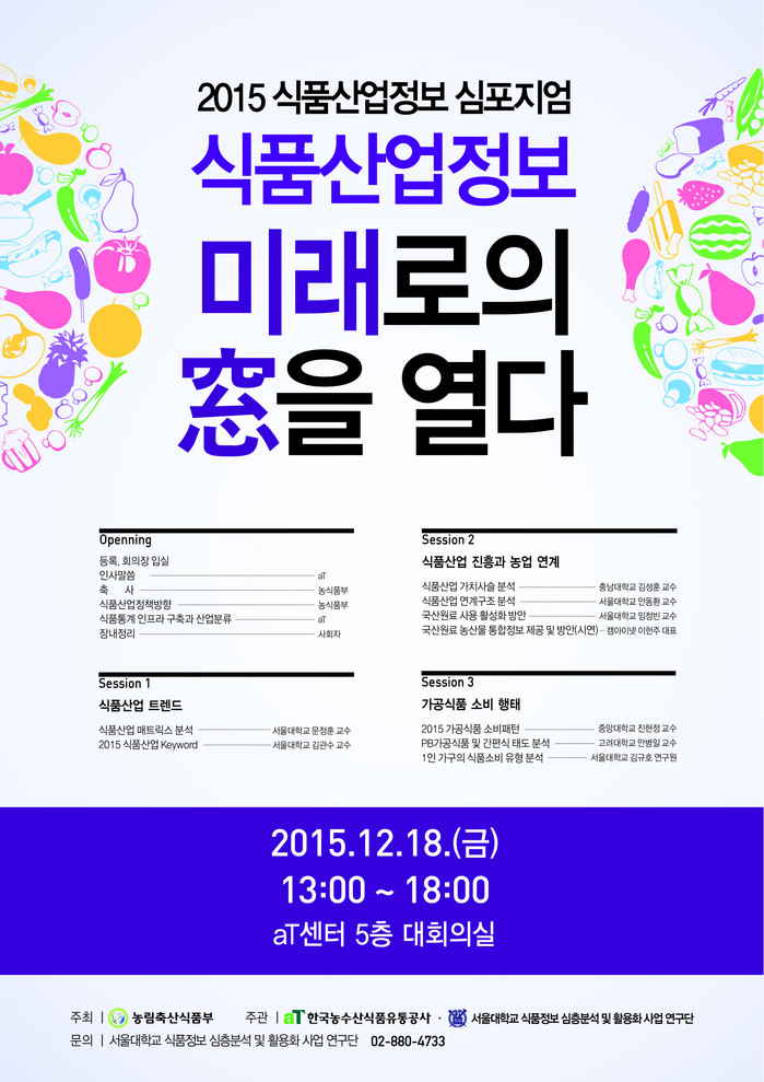 이번 심포지엄은 식품산업에 관심있는 사람은 누구나 별도의 사전등록 없이 무료로 참석 가능하다. 식품산업정보 심포지엄에 대한 문의는 aT 식품기획부(061-931-0717)와 서울대학교 식품정보 심층분석 및 활용화 사업 연구단(02-880-4733)으로 하면 된다.