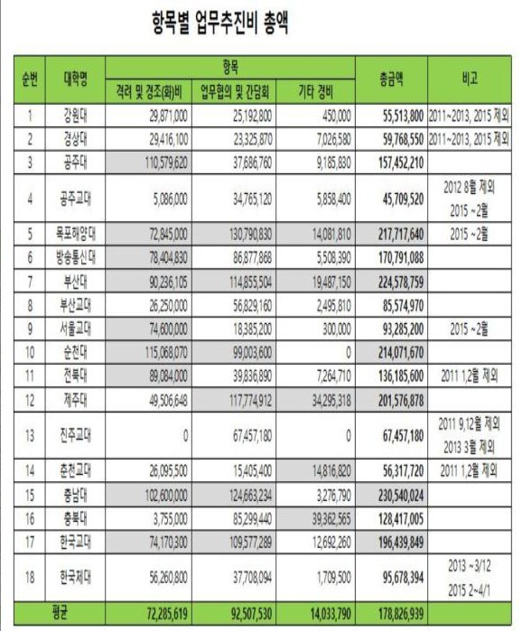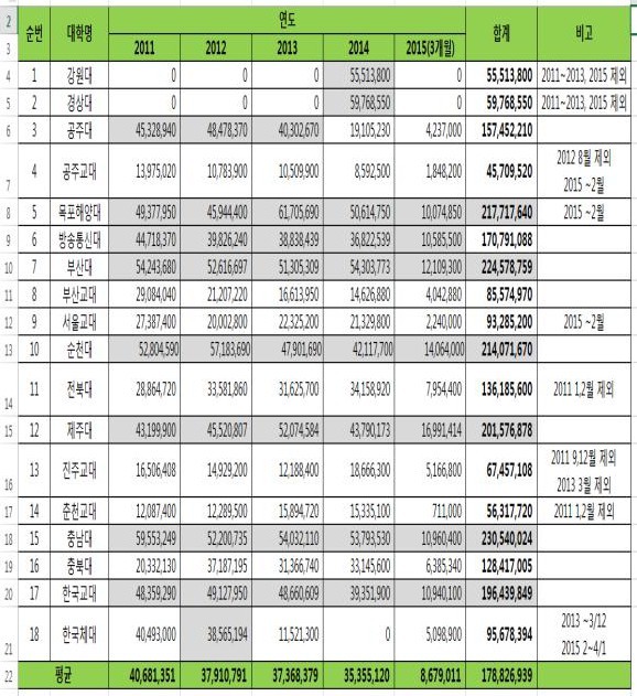 공개자료에는 가장 많은 금액을 지출한 충남대와 부산대, 목포해양대 등은 해당 기간 내에 2억 원이 넘는 금액을 사용 4570만원을 사용한 공주교대의 5배가량을 기록했다고 밝혔다.