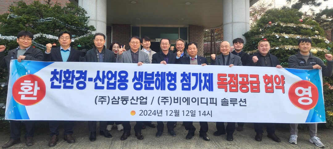 ㈜삼동산업(대표이사 정현우)는 12일 오후, 충남 천안 본사 회의실에서 ㈜비에이디피코리아(대표이사 고신성)의 국내 총판기업인 (주)비에이디피솔루션과 협력지사인 (주)비에이디피 충남이 미생물효소 기반의 석유화학플라스틱 생분해 첨가제 BADP(Bio Acceleratrd Degradable Plastic)를 산업용 보호필름에 적용하기위한 공급 협약했다.