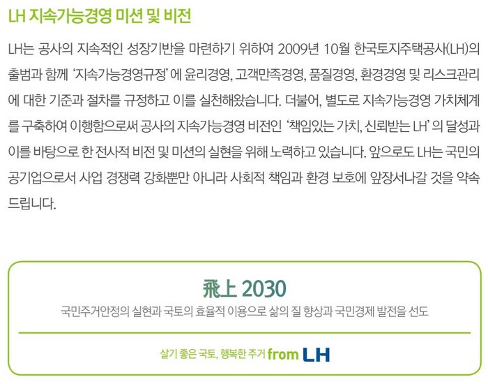 | ▲LH공사는 경영에 대한 입장을 통해 책임있는 가치, 품질경영, 환경경영 신뢰받는 LH공사라고 홍보하고 있다. |