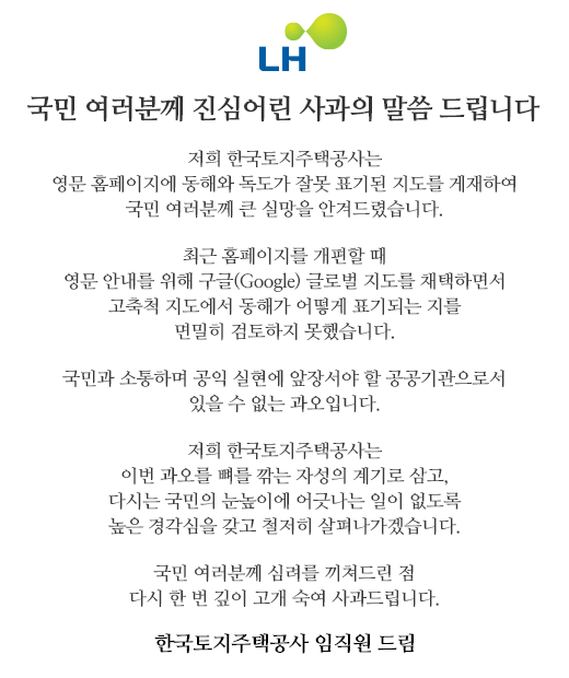 ▲LH공사는 자사의 홈페이지에 우리나라 영토 독도문제가 민감한 해역표시인 동해라는 표시를 하지 않아 지적을 받고 사과문을 내걸기도 했다. |