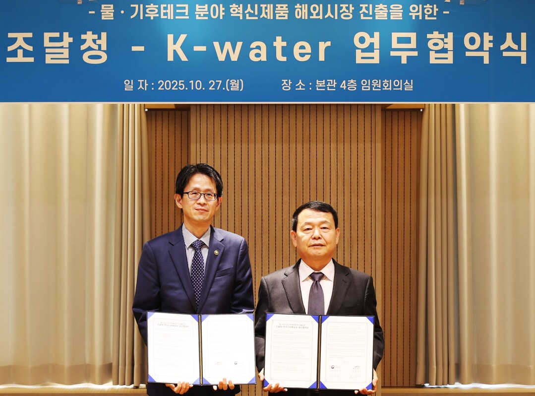 K-water 한국수자원공사(사장 윤석대)는 27일 본사에서 조달청과 '물·기후테크 분야 혁신제품 해외시장 진출 지원' 업무협약을 체결했다.