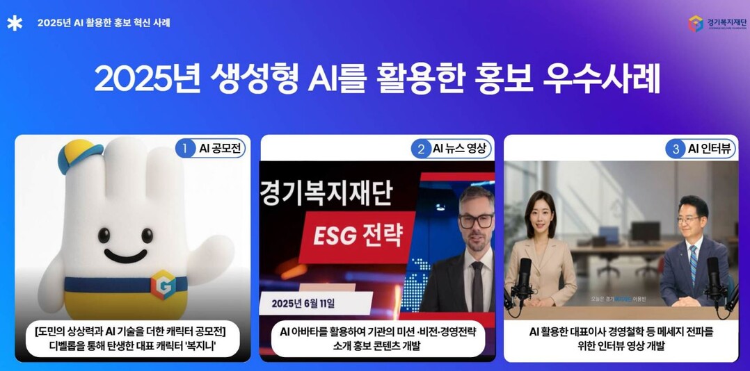 경기복지재단(대표이사 이용빈)은 급변하는 디지털 미디어 환경에 발맞춰 인공지능(AI) 기술을 공공 홍보 영역에 도입하여 업무 효율성을 극대화한 사례를 공개했다. 이를 통해 도출된 성과를 경기도 산하 공공기관에 전파해 홍보 업무 효율화 및 내부 홍보 전략 수립에 참고 자료로 지원할 계획이다.