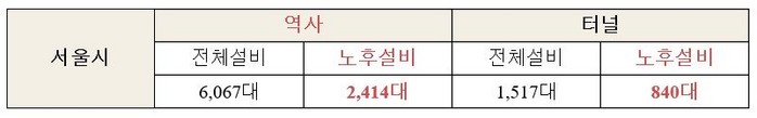 서울시의 도시철도 기관별 환기설비 7584대 중 3254대가 노후설비이며, 특히 지하철 역사의 환기설비 6067대 중 노후설비는 2414대로 무려 40%를 차지하고 있다. 노후설비는 20년 이상 사용한 환기설비다.