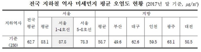 박 의원실 자료에 따르면, 서울시 지하철 1호선~ 4호선의 미세먼지 오염도는 87.8마이크로그램(㎍/㎥)으로 지방 평균 미세먼지 오염도 58.7마이크로그램(㎍/㎥)에 비해 2배에 가까울 정도로 높다.