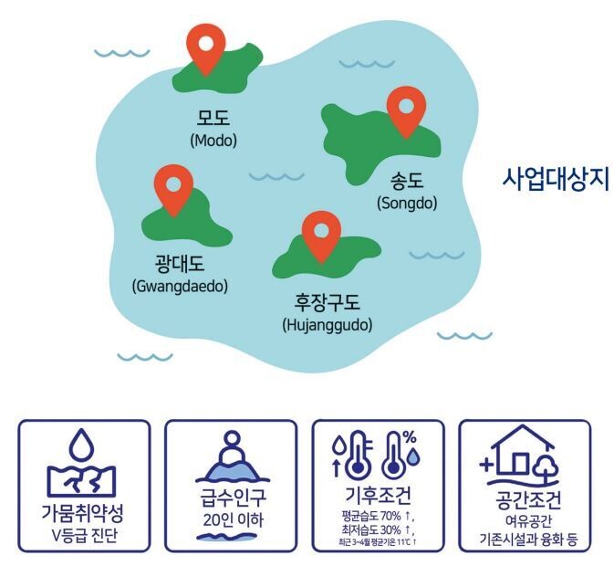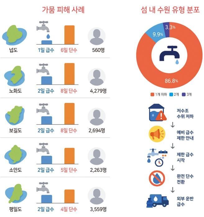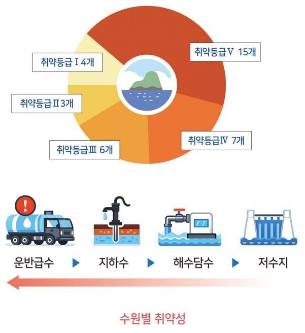 특히 섬 지역은 지형·인프라 한계로 가뭄에 구조적으로 취약하며, 다수의 유인섬이 광역상수도망에 연결되지 못한 채 단일수원에 의존하고 있어 고갈과 염분 침투, 시설 노후화 등 복합적인 위험에 노출돼 있다.