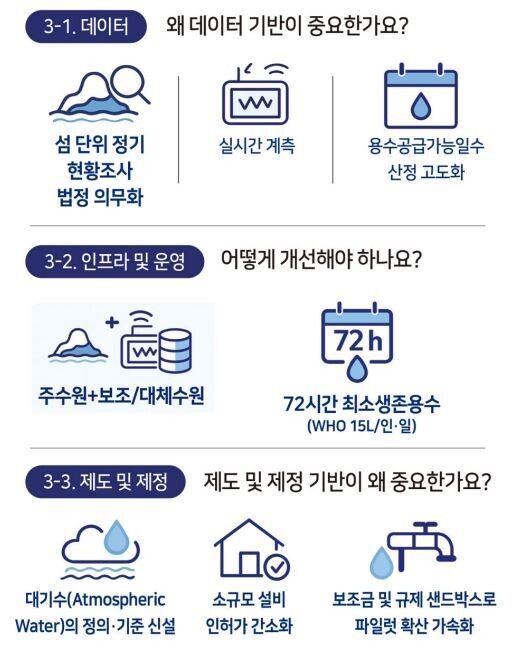 이와 같은 공급체계의 실행을 위해 ▲섬 단위 용수시설 상시 조사 의무화 ▲AWH 등 신규 대체수자원 제도권 편입을 위한 법·제도 정비 등이 뒷받침이 돼야 한다고 덧붙였다.