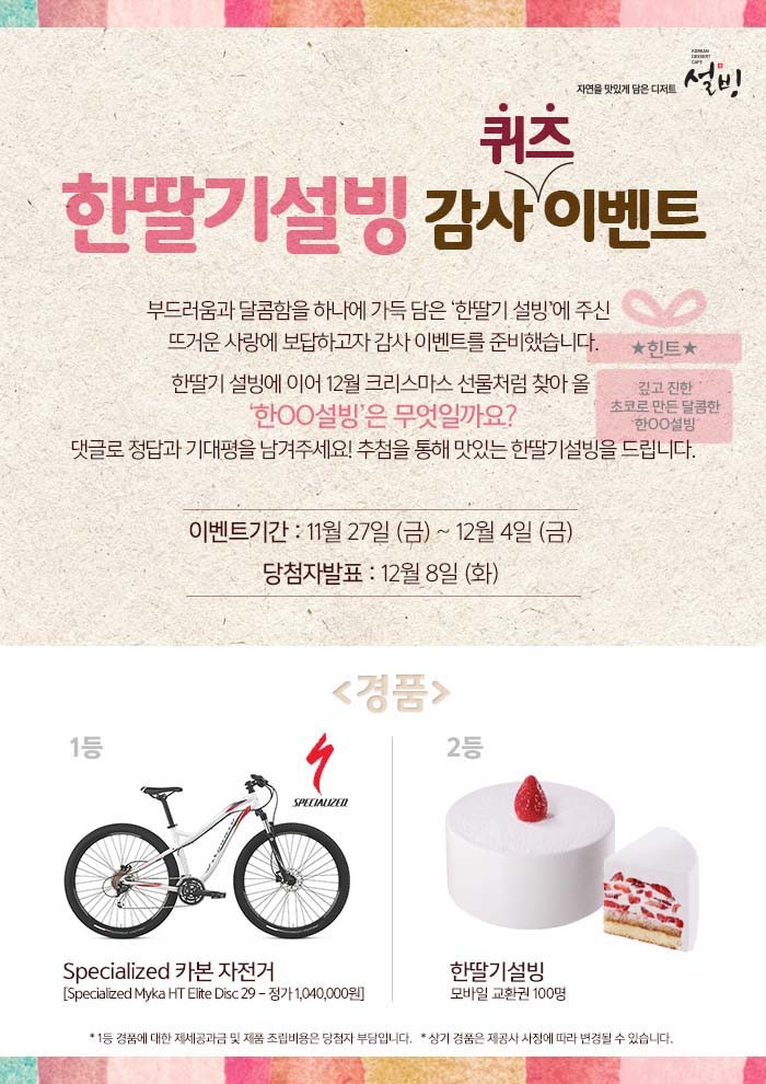 이벤트는 11월 27일부터 12월 4일까지 설빙의 공식 페이스북(facebook.com/sulbing)을 통해 참여할 수 있으며, ‘한딸기설빙에 이어 12월의 크리스마스 선물처럼 찾아온 신 메뉴’의 이름을 맞추는 퀴즈게시물에 정답을 댓글로 남기면 된다. 이벤트에 참여한 고객 중 추첨을 통해 1등에게 스페셜라이즈드 하이브리드 카본 자전거를 증정, 100명에게 ‘한딸기설빙’ 모바일 교환권을 증정한다.