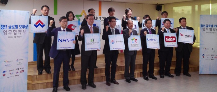 16일 서울 광화문 청년희망재단에서 열린 진행된 MOU체결식에 사업총괄기관인 청년희망재단과 식품산업을 대표하는 aT 및 각 산업군 대표기관과 청년파견기업인 NH무역 등 10개 수출기업이 한자리에 모여 청년 글로벌 보부상 사업을 위한 업무협약(MOU)을 체결했다.