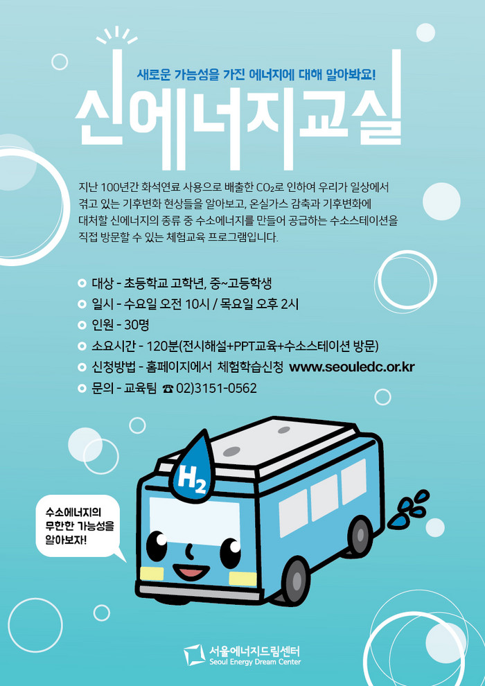 지난 100년간 화석연료 사용으로 배출한 CO2로 인해 우리가 일상에서 겪고 있는 기후변화 현상들은 알아보고, 온실가스 감축과 기후변화에 대처할 신에너지의 종류 중 수소에너지를 만들어 공급하는 수소스테이션을 직접 방문할 수 있는 체험교육 프로그램이다.