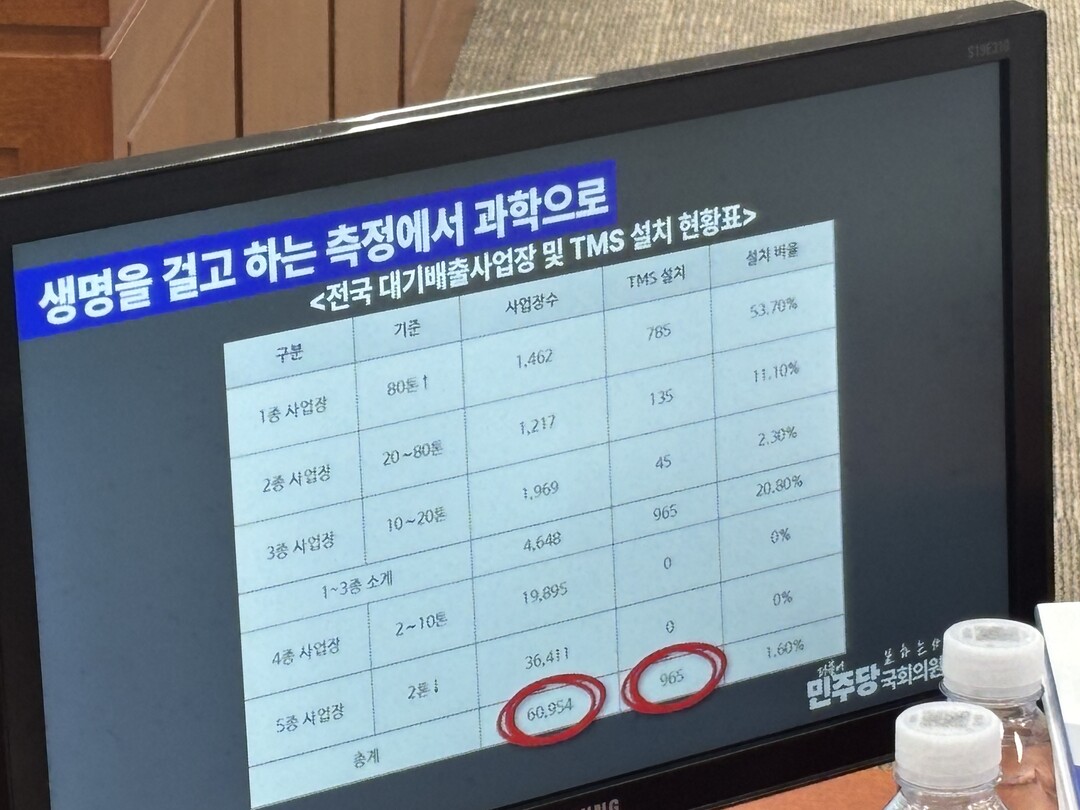 또 "현재 굴뚝자동측정기기(TMS)가 설치된 사업장은 965곳, 전체 6만954개 배출사업장의 1.6%에 불과하다."며 "TMS는 설치비가 비싸고, 비산·간헐 배출을 포착하지 못하는 한계가 있다."고 지적했다.