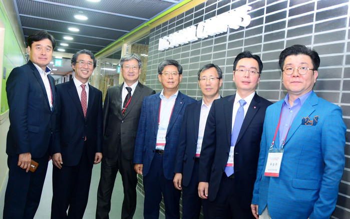 | ▲LG전자가 사회적경제 조직에게 사무공간을 무상 임대하기 위해 고려대학교 안암캠퍼스 산학관 내에 'LG소셜캠퍼스(Social Campus)'를 마련하고 11일 개관식을 열었다. 참석자들이 입구에서 'LG소셜캠퍼스'를 소개하고 있다. 좌측부터 LG전자 윤대식 상무, 사회연대은행 김용덕 대표, 사회적기업연구원 조영복 교수, LG전자 이충학 부사장, 한국사회적기업연구원 김종각 본부장, LG화학 박준성 상무, 입주기업 대표 극단 날으는 자동차 우승주 대표. © 환경데일리 |