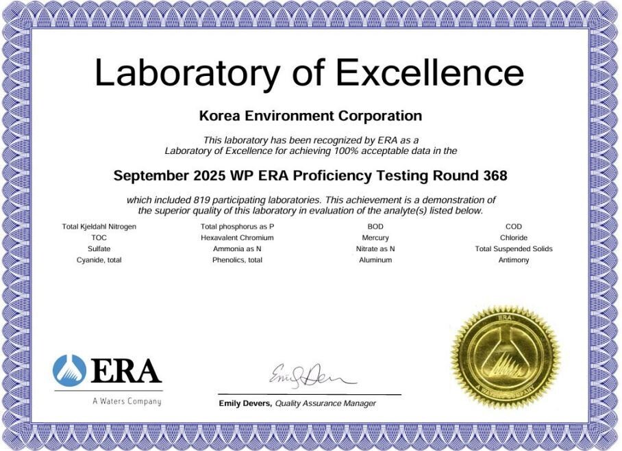 K-eco 한국환경공단(이사장 임상준)은 미국 환경자원협회(ERA)가 주관하는 2025년도 국제숙련도시험에서 14년 연속 '최우수 분석기관(Laboratory of Excellence)'으로 선정됐다고 19일 밝혔다.