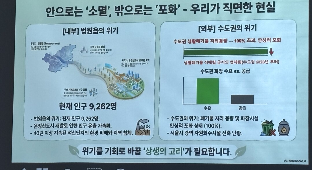 그 중 대표적인 경기 파주시가 호시탐탐 노려온 공공소각장 건립을 위한 지난달 31일 법원읍주민자치위가 설립 추진을 준비하기 위한 첫 주민설명회가 열렸다.