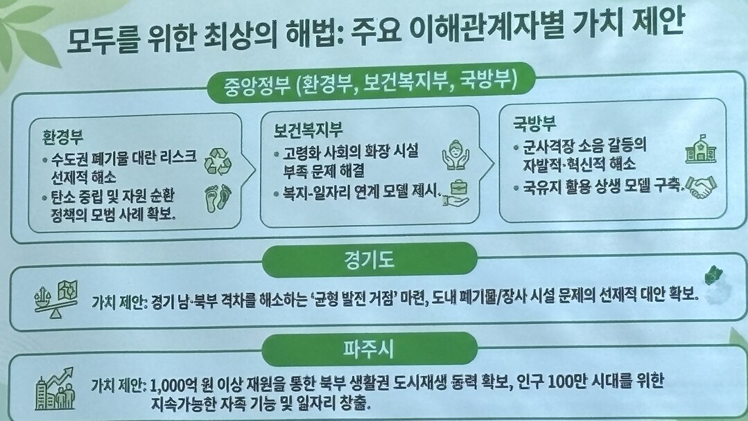 특히 "경기 하남과 구리, 충남 천안 등 소각시설은 가보니, 주민친화시설로 확인했고, 만약 우리 파주에도 신규 건립된다면 세계적인 시설로 유명한 일본, 덴마크 등지 인근 주민들이 누리는 혜택처럼 우리도 꼭같이 가능해 전향적인 시선으로 봐야 한다."고 했다.