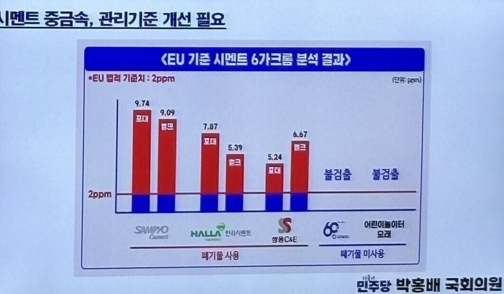 문제는 시멘트업계다. 생활쓰레기는 매우 좋은 원료화로 치부해왔지만 소각시설과 달리 대기오염물질 배출량은 높고, 시멘트 속에는 기준치를 휠씬 웃도는 발암성 오염물질 중금속이 범벅인데 고급 아파트 콘크리트로 제공하고 있다.