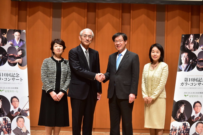 | ▲신일철주금의 신도 코세이 사장 부부(왼쪽)와 포스코의 권오준 회장 부부(오른쪽)가 10회를 맞이한 문화교류음악회를 축하하고 있다. © 환경데일리 |