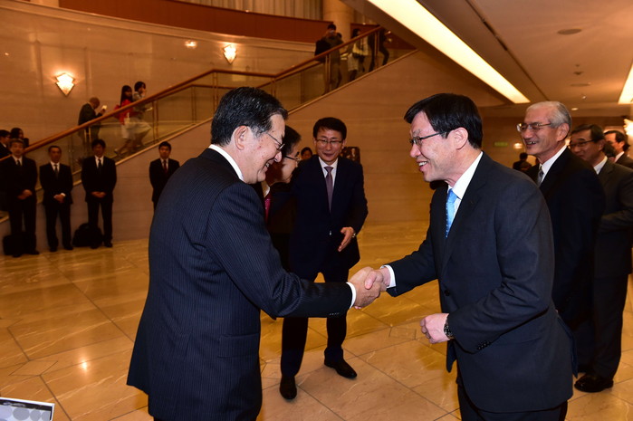 ▲무네오카 쇼지 신일철주금 회장(왼쪽)과 권오준 포스코 회장(오른쪽)이 악수를 하고 있다. © 환경데일리 |