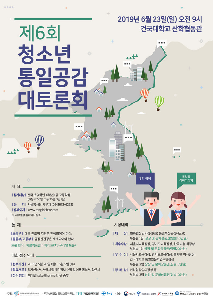[환경데일리 김영민 기자]민족화해협력범국민협의회(대표상임의장 김홍걸)는 6월 23일 건국대(산학협동관)에서 '제6회 청소년통일공감대토론회'를 개최한다. 이번 행사는 민화협 통일교육위원회, 건국대 통일인문학연구단, 흥사단이 공동주관으로 진행하며, 예선을 통과한 초, 중, 고 총 40팀(120여명)과 학부모, 지도교사 등 약 200여명이 본선대회에 참가할 예정이다.