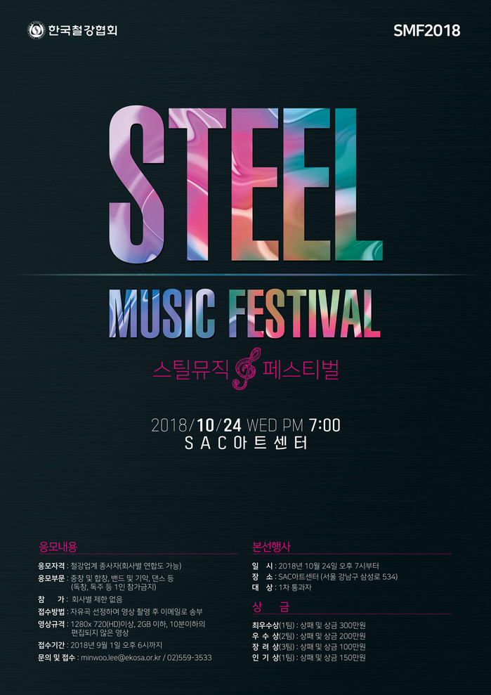 이번 STEEL MUSIC FESTIVAL 2018은 누구나 무료로 관람할 수 있고, 문의는 한국철강협회로 하면 된다.