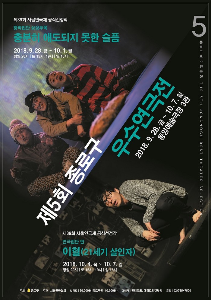 올해는 2018 제39회 서울연극제 공식선정작 중 창작집단 상상두목의 <충분히 애도되지 못한 슬픔>, 연극집단 반의 <이혈(21세기 살인자)> 등 두 작품이 무대에 올라 관객들에게 묵직한 여운을 선사할 예정이다.