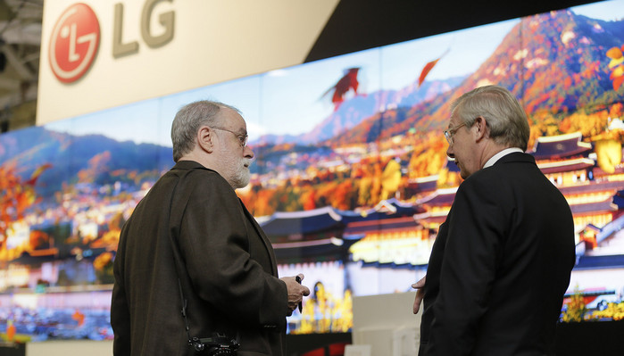 LG전자는 55인치 올레드 사이니지 18장을 이어붙인 비디오월도 선보였다. 이 제품은 쓰임새에 따라 필요한 만큼 확장할 수 있어 활용도가 뛰어나다.