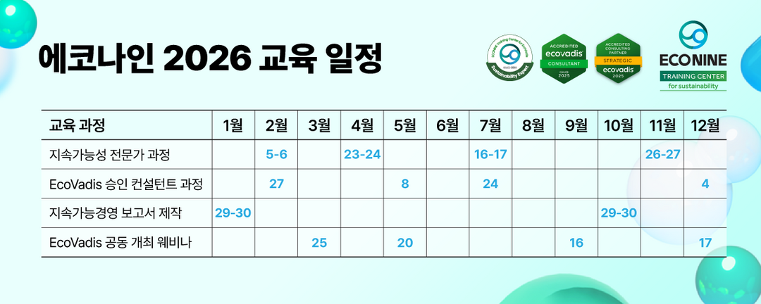 ESG 지속가능경영 자문 그룹 에코나인이 2026년을 맞아 정기 ESG 교육 일정을 공개하고, 연초 핵심 과정인 '지속가능경영 보고서 제작 2기'와 '지속가능성 전문가 과정 4기' 모집에 나섰다.
