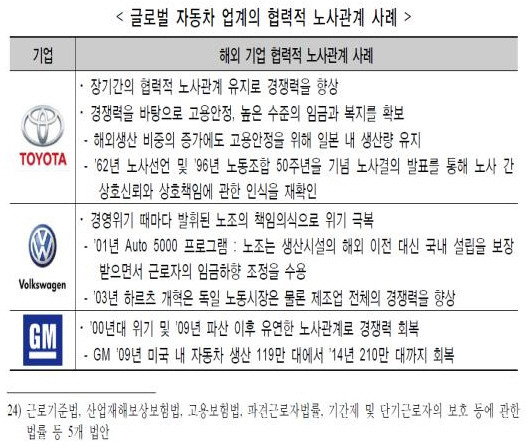 박근혜 정부의 최대 쟁점인 노동개혁법 도입으로 경직된 노동시장에 유연성을 제공함으로써 생산 공장의 효율화 달성 및 글로벌 경쟁력 확보도 힘겹기는 마찬가지다.