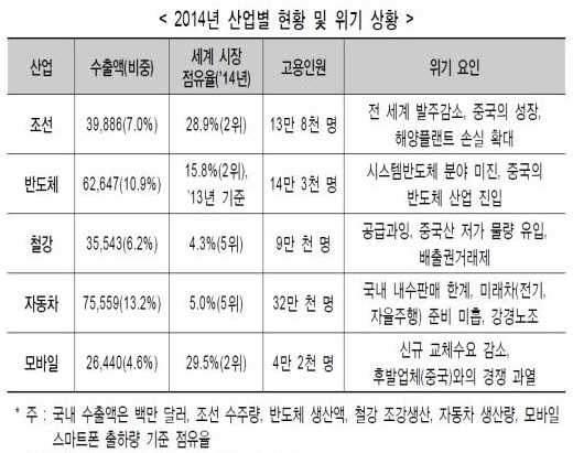 국내 설비과잉 및 수익성 하락에 따른 한계기업 문제가 대두되고 있으며, 중국의 추격으로 국내 주력산업의 전 세계 시장에서의 경쟁 강도 상승이 예상된다.