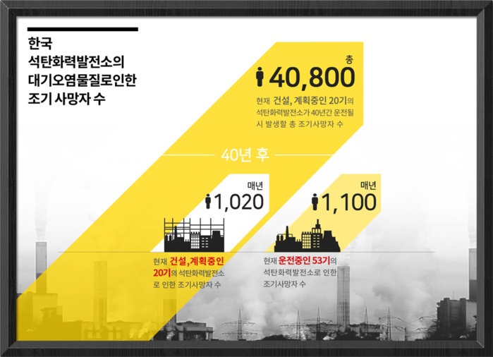 그 이유는, 최근 연구에 따르면, 현재 건설중이거나 계획된 석탄화력발전소에서 뿜어져 나오는 공해 물질로 인해, 최대 4만 명이 조기사망에 이를 수 있기 때문. 모두 '살인면허'취소를 위해, 힘을 모아야 한다.