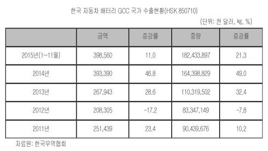 한국산 자동차 배터리 제품들이 GCC 국가 수출량은, 2013년 이후 크게 늘려왔다. GCC 국가 한국산 자동차 배터리 수입액이 2013년 2억6794만 달러를 기록, 2014년 3억9339만 달러로 46.8%로 성장해 이후 지속적으로 상승했다.