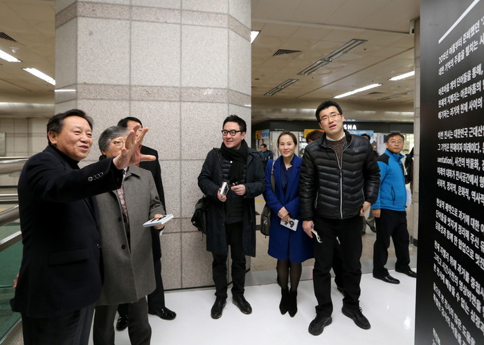 | ▲차성수 금천구청장(사진 왼쪽)이 개관식에서 참석자들과 함께 G밸리 갤러리를 둘러보면 설명을 하고 있다. © 환경데일리 |