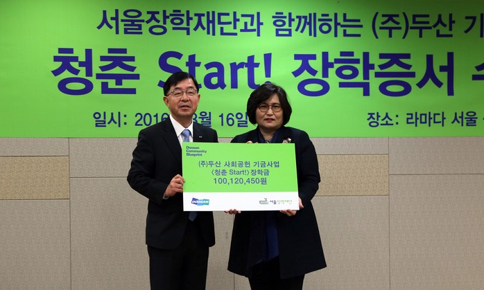 2013년부터 서울장학재단(이사장 문미란)과 함께 진행하고 있는 청춘 Start! 장학사업은 ㈜두산 임직원들의 기부와 회사 매칭그랜트(Matching grant)로 조성된 기금으로 운영되는 장학사업이다.