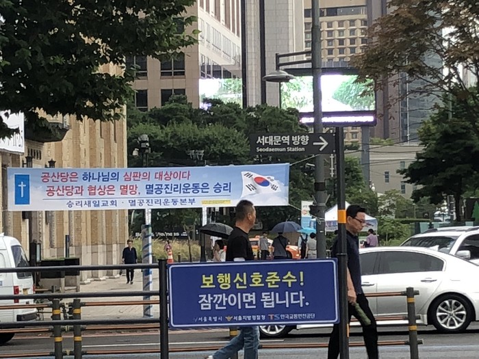 ▲집회 목적으로 내건 현수막 역시 불법이다. 사이비 종교와 다를 바 없는 한 단체가 광화문에 현수막을 걸어놓고 있다. 불법현수막 은 건설사의 아파트 분양이 대표적이다. 선거철이면 정당법에 따라 합법적으로 거리에 내건 현상이 따라서 내거는 악순환이 되고 있다. |
