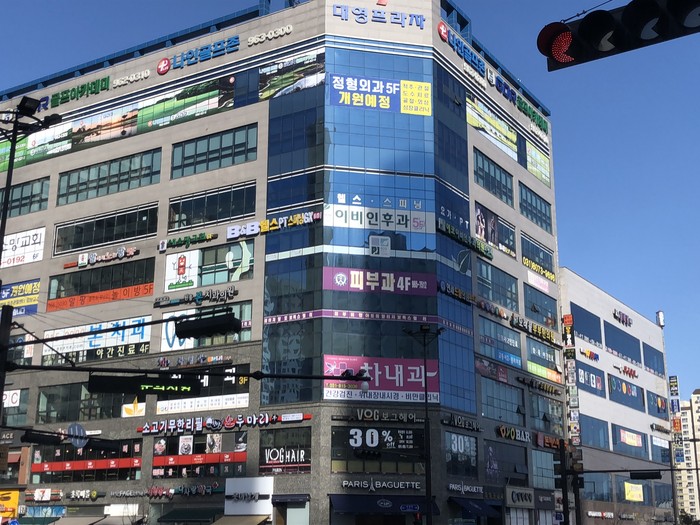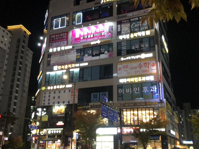 ▲상업건물에 옥외광고물 간판은 2개로 제한하고 있고 크기도 규제하고 있다. 하지만 이를 지키는 자영업 점포는 많지 않다. 불법 광고물 간판을 5대 악덕 점포는 휴대폰판매점, 술집, 부동산중개업소, 학원, 병의원이 대표적이다. 임대해 입주한 창문까지 불법으 로 글자나 그림으로 심지어 LED조명까지 설치하고 있지만 정부와 지자체는 손도 못쓰고 있는 실정이다. 사진 박노석 기자 |