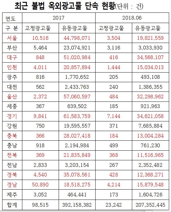 불법 옥외광고물 과태료 부과 건수는 총 27만4804건으로 액수로는 약 3000억 원에 달했다. 가장 많은 부과 건수를 보인 지역은 서울로 총 15만5513건이었으며 이어 광주 5만924건, 경기 2만2935건 등이었다.