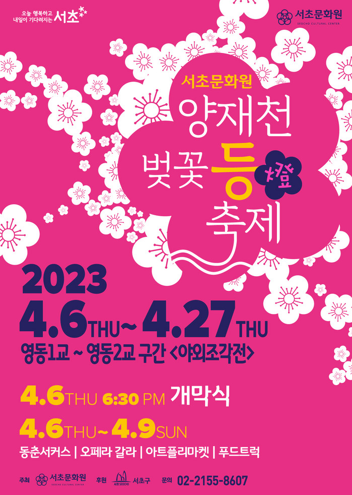 먼저 '양재천 벚꽃 등(燈) 축제'는 양재천 영동1교에서 영동2교 2.4km 벚꽃길 구간에서 오페라, 야외 조각전, 문화체험 등과 어우러진 종합예술 행사다. 낮은 공연, 전시, 체험 등과 함께 벚꽃을 감상하고, 밤에는 LED 경관조명이 달빛과 함께 양재천변을 비추며 야간 벚꽃 운치를 느끼도록 했다.